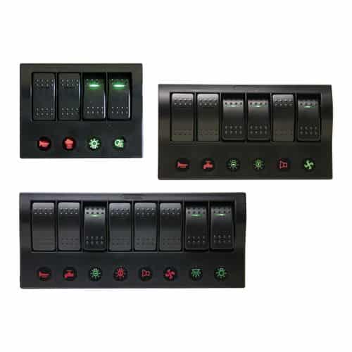 Pannelli in Plastica stabilizzata resistente UV con protezione IP65, precablati, con interruttori impermeabili dotati di spie LED, valvole automatiche reinseribili ed etichette prestampate. Il primo interruttore è (ON)-OFF per segnalazione acustica.