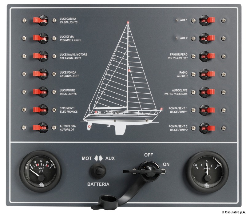 Completi di voltometro e amperometro e di staccabatteria 14.385.00. Completi di check-panel a LED extra luminosi che si accendono in corrispondenza dell’utenza in uso.