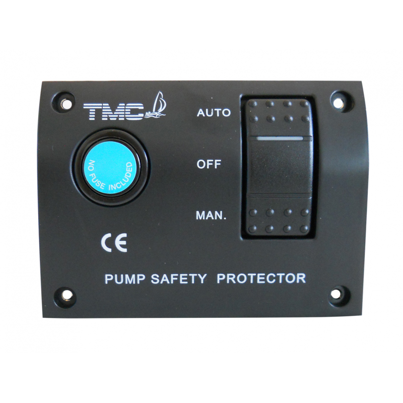 Pannello per pompa di sentina con porta fusibile e interruttore basculante con spia luminosa a 3 posizioni MANUALE-OFF-AUTOMATICO. Alim. 12V.Dim. mm. 116X87X32 prof.
