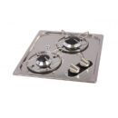 Piano cottura a gas con accensione manuale, in acciaio inox lucidato a specchio. Montaggio ad incasso. Con termocoppia di sicurezza. Completo di viti di fissaggio. Con foro per ferma pentole. Certificati CE.