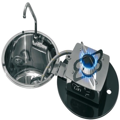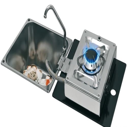 Piano cottura ribaltabile in acciaio inox lucidato completo di rubinetto pieghevole e coperchio in vetro temperato.