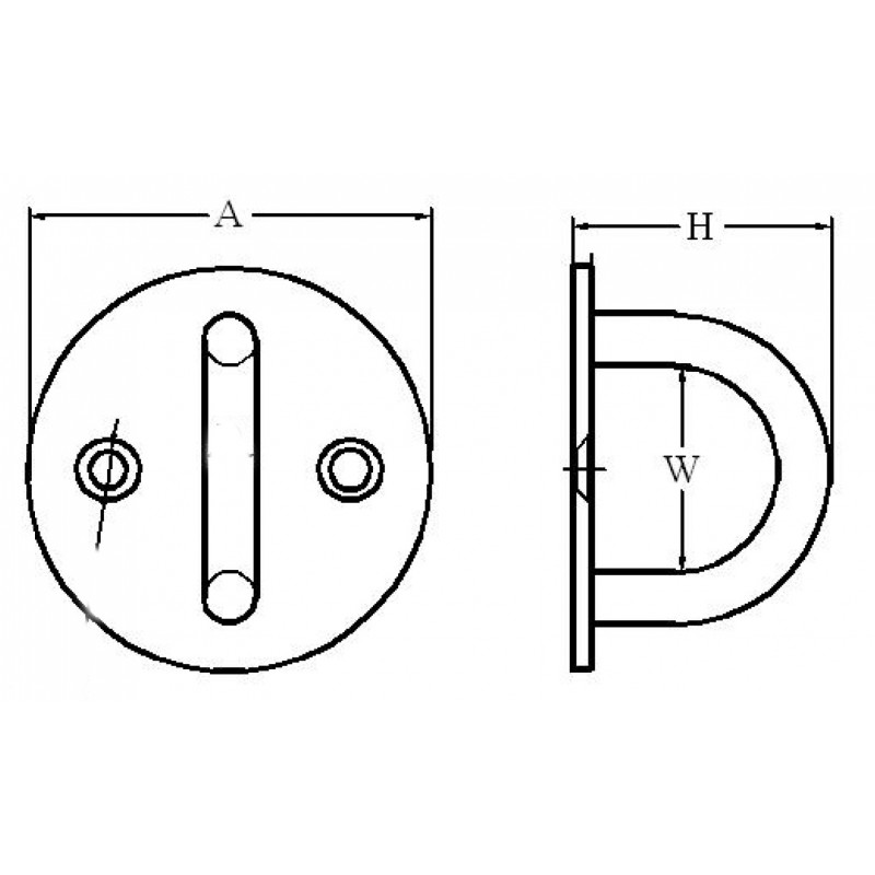 Piastra tonda in acciaio inox AISI 316 con cavallotto e fori per viti.