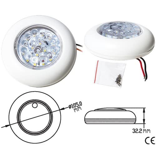 Plafoniera a 16 led a luce fredda con sistema di accesione e spegnimento a pressione,corpo materiale plastico resistente agli spruzzi, completa di viti per il fissaggio. Testata in conformità alla normativa comunitaria CE e RoHS 2004/108/EC.