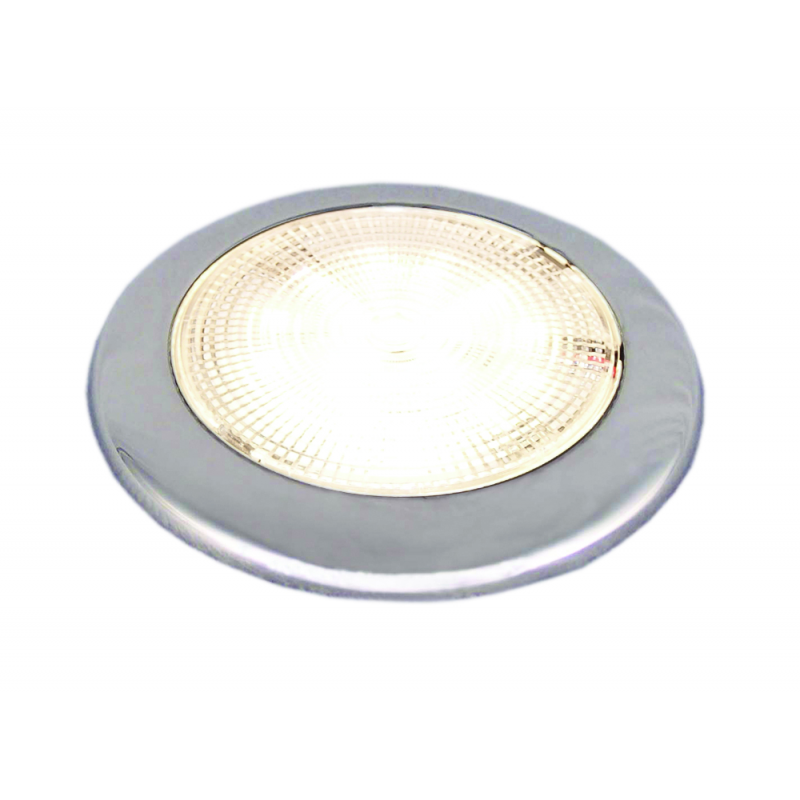 Plafonierain acciaio inox a 28 LED. Montaggio a filo con viti situate sotto il diffusore. Alim. 12V. Consumo 2,26W,illuminazione equivalente a 15W standard. IP66. Luce bianca calda (4000-4500°K), 110 lumen. Dim. Ø mm. 132x10h.