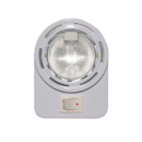 Plafoniera alogenain plastica bianca, completa di interruttore, per montaggio esterno. Completa di lampadina 10 W, 12V. Dim. Ø mm. 66 x 90, sporg. mm. 21,5. 3 fori difissaggio.