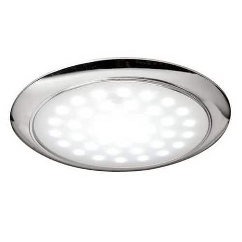 Plafoniera con corpo in ABS, lente in vetro satinato, versione ultrapiatta senza incasso con interruttore touch e due livelli di luminosità.