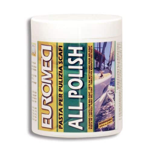 Pasta leggermente abrasiva ad azione rapida per pulire energicamente e rinnovare scafi in vetroresina, sovrastrutture, ponti e parabordi, applicabile a spazzola e si risciacqua con acqua.