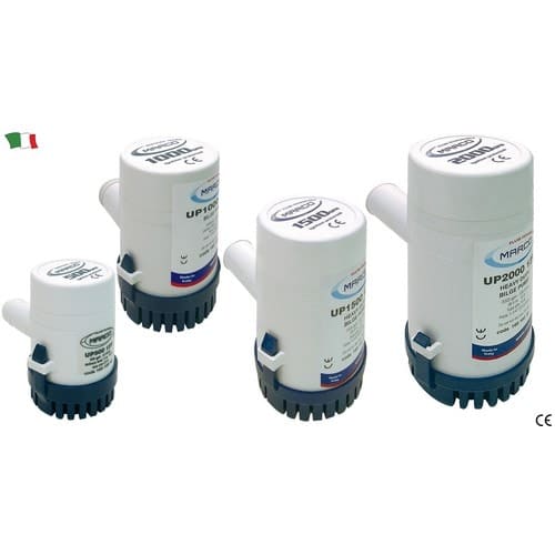 Elettropompa di sentina ad immersione con involucro in robusto ABS antiurto, resistente alla corrosione ed alla elettrolisi.