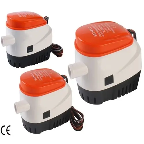 Pompa di sentina seaflo automatica con galleggiante incorporato ed alberino in acciaio, resistente e facile da installare con rimozione a scatto sulla base. Certificate CE ISO 8846.