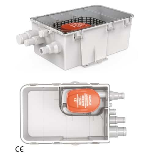 Pompa di svuotamento per doccia progettata per l’utilizzo su imbarcazioni provviste di lavello ad incasso, doccia, o vasca da bagno, per pompare tutta l’acqua dagli scarichi dentro al serbatoio di raccolta. compatta, può essere montata a pavimento oppure a parete, in quest’ultimo caso eliminando i due sostegni. E’ dotata di una pompa di sentina automatica incorporata che si attiva appena il galleggiante avverte la presenza dell’acqua. Inoltre ha un filtro che può essere facilmente pulito togliendo la copertura superiore trasparente ed è provvista di una valvola di non ritorno collegata al tubo di scarico. L’involucro della pompa è fabbricato in resistente polipropilene ed il coperchio in acrilico. Il sistema di prosciugamento ha 3 tubi di entrata (2 da 19,1 mm (3/4”) e 1 da 25,4 mm (1”) ed un tubo di scarico con valvola di non ritorno per tubo di diametro da 19,1 mm (3/4”) e 25,4 mm (1”).