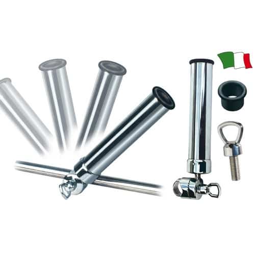 Portacanna in ottone cromato con morsetto registrabile da battagliola e tienibene con boccola interna in gomma.