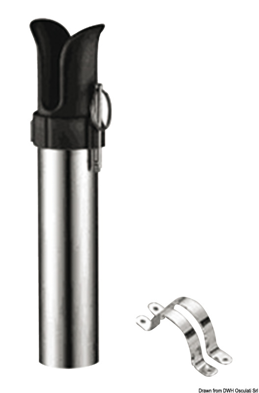 In acciaio inox lucidato ed imboccatura in tecnopolimero. Completo di fascette di fissaggio e spinotto estraibile per fissaggio canna.