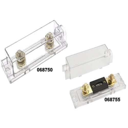 Portafusibile in materiale termoplastico con coperchio protettivo amovibile.