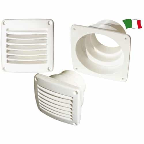 Presa d’aria in materiale plastico colore bianco, resistente alla benzina completo di manicotto in ABS per il collegamento dei tubi d’aspirazione per gas alla paratia.