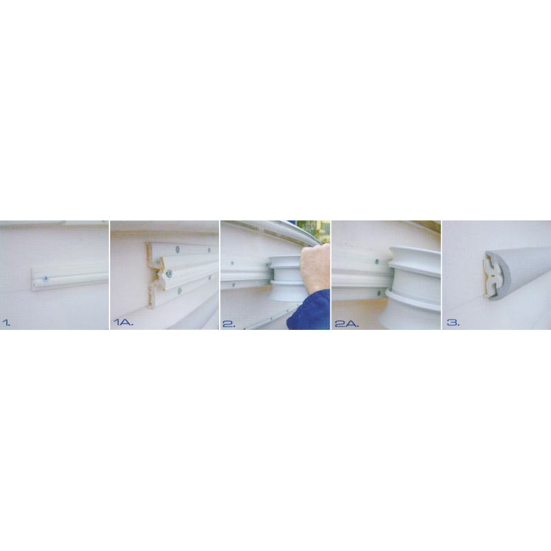Profilo parabordo brevettato in PVC per accoppiamenti scatolati. La peculiarità di questo profilo è quella di poter essere applicato a freddo in pochi, veloci passaggi. 1/1A – Applicazione del binario, avvitamento/rivettatura 2/2A – Applicazione del profilo rivoltandolo allindietro il più possibile con una curva ben accentuata, (Radial 80 deve essere scaldato a 40° C), i due inserti di tenuta si apriranno, spingere energicamente verso il binario rigido, avanzando velocemente 3 – Prodotto applicato Mod. Radial 30, A mm. 15, B mm. 30, C mm. 17, Conf. mt. 16.