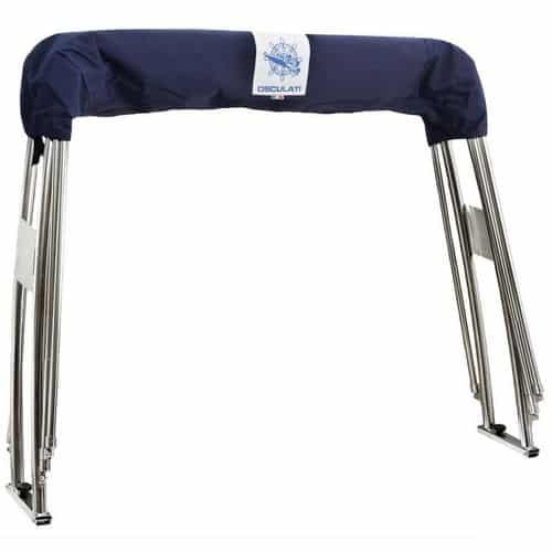 Telaio Roll-Bar in acciaio inox Ø 40 mm con telaio capottina in acciaio inox Ø 22 mm. Tessuto capottina ad alta resistenza (si può viaggiare fino a 35 nodi con capottina aperta) e resistente ai raggi UV. Quando non in uso la capottina si ripiega contro il Roll-Bar che, nella parte superiore, ha un supporto libero per fanale di via/tromba/pannello solare.