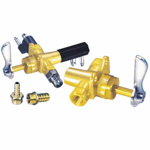 Rubinetto in ottone a tre vie con filettatura per portagomma.