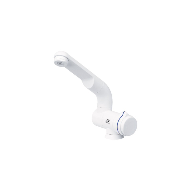 Rubinetto di colore bianco abbattibile. Con ugello a spruzzo per un flusso d’acqua uniforme.