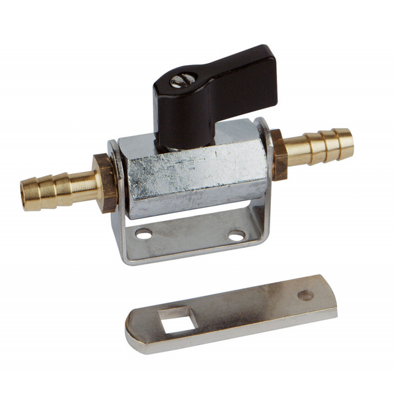 Valvola in ottone cromato per carburante. Movimento a sfera, regolamentare R.I.Na., dotato di braccetto per comando a distanza. Passaggio interno Ø mm. 8, filettatura f/f da 1/4” gas. Completo di supporto a parete e due porta gomma da 1/4” x 10 . Con il supporto si può montare lungo la tubazione, senza il supporto direttamente sul serbatoio.