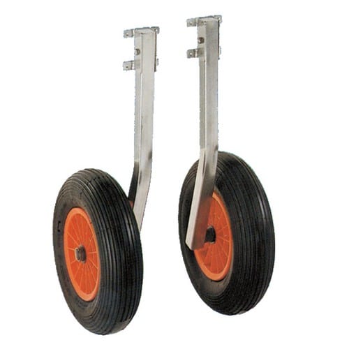 Ruote alaggio a ribalta per battelli pneumatici e piccole imbarcazioni. Gambo e attacchi in ACCIAIO INOX, cerchi in nylon rinforzato, pneumatici a sezione larga.