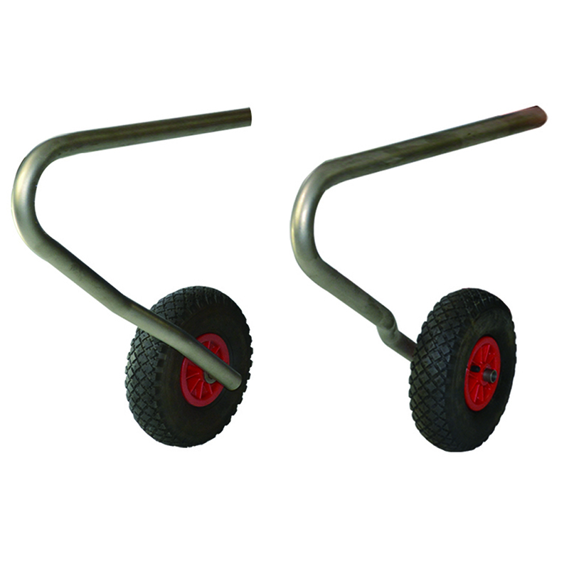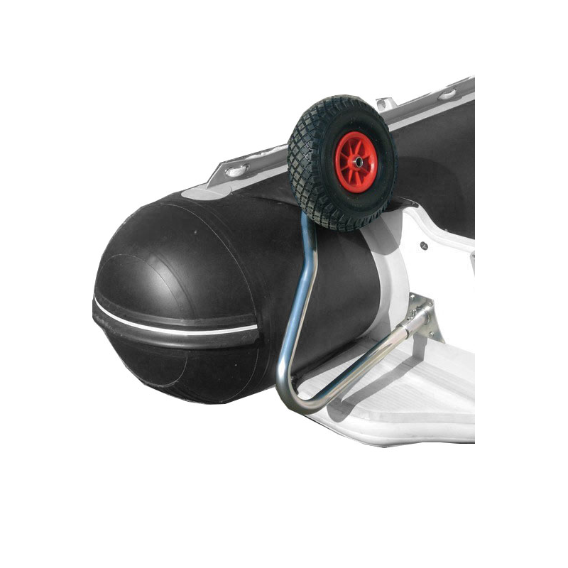 Ruote di poppa ribartabili per alaggio e varo canotti pneumatici provvisti di flap stabilizzatori gonfiabili. Gambi e attacchi in acciao inox, ruote in gomma gonfiabili con cerchi in nylon. Montaggio sullo specchio di poppa.Altezza mm 600, Ø ruote mm 260, Ø tubo mm 30