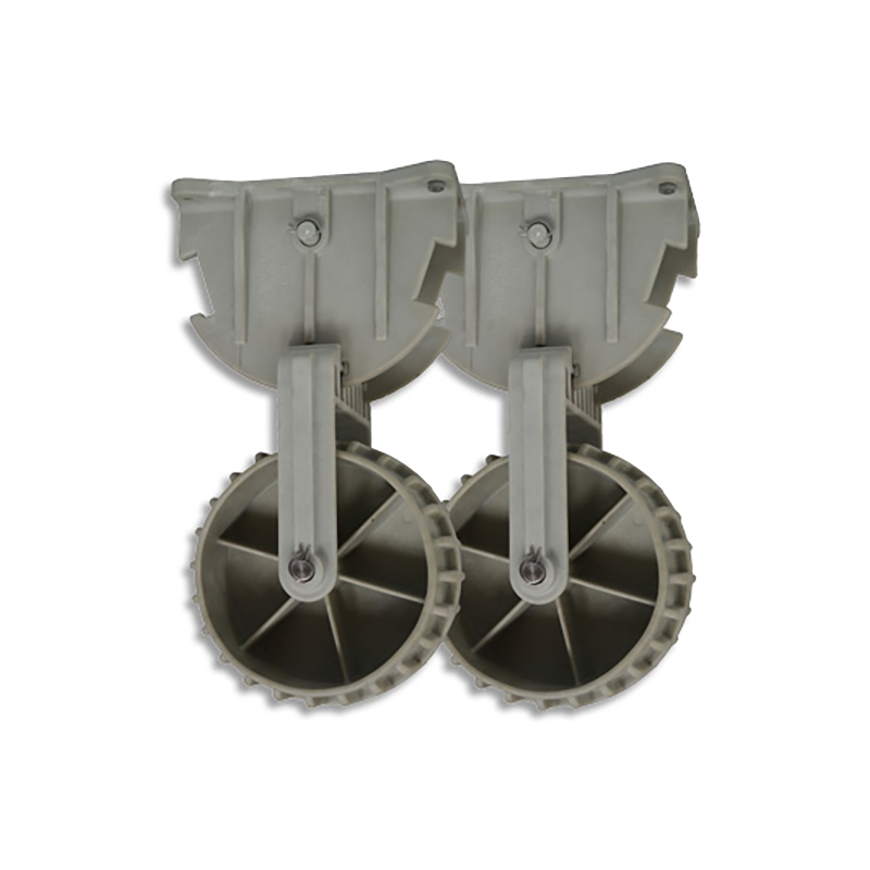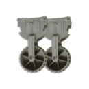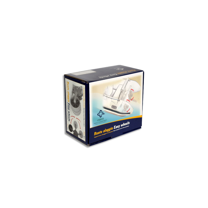 Ruote di poppa ribaltabiliper alaggio e varo canotti pneumatici, barche in alluminio e vetroresina.Fabbricate in materiale plastico, portata massima motore incluso kg.110.Montaggio sullo specchio di poppa. Altezza mm.300, Ø ruote mm 135