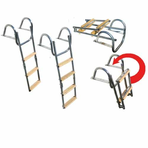 Scaletta di risalita ribaltabile per plancette di poppa con corrimano, costruita in ACCIAIO INOX AISI 316 con gradini in legno.