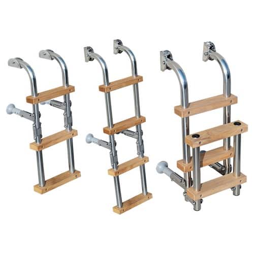 Scaletta pieghevole adatta per piccole imbarcazioni o battelli. Costruita in ACCIAIO INOX AISI 316 lucidato e gradini in legno antiderapante. Piedini con terminali in PVC, telescopici e basi d’appoggio registrabili.
