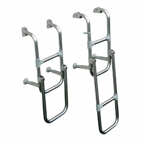 Scaletta pieghevole in ACCIAIO INOX AISI 316 lucidato, con giunti e piedini in PVC. I piedini sono telescopici e le basi d’appoggio registrabili.