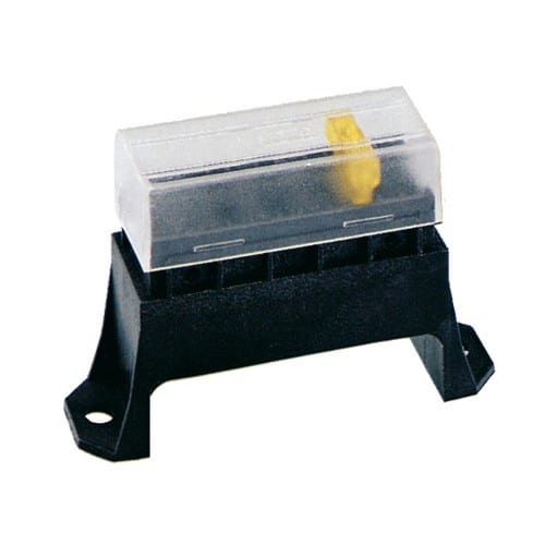 Scatola portafusibili per fusibili lamellari completa di coperchio protettivo trasparente.