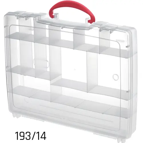 Scatola Porta Minuterie 193/14 in plastica da pesca di colore trasparente e manico rosso dotata di maniglia e clip d’incastro per accoppiatura.