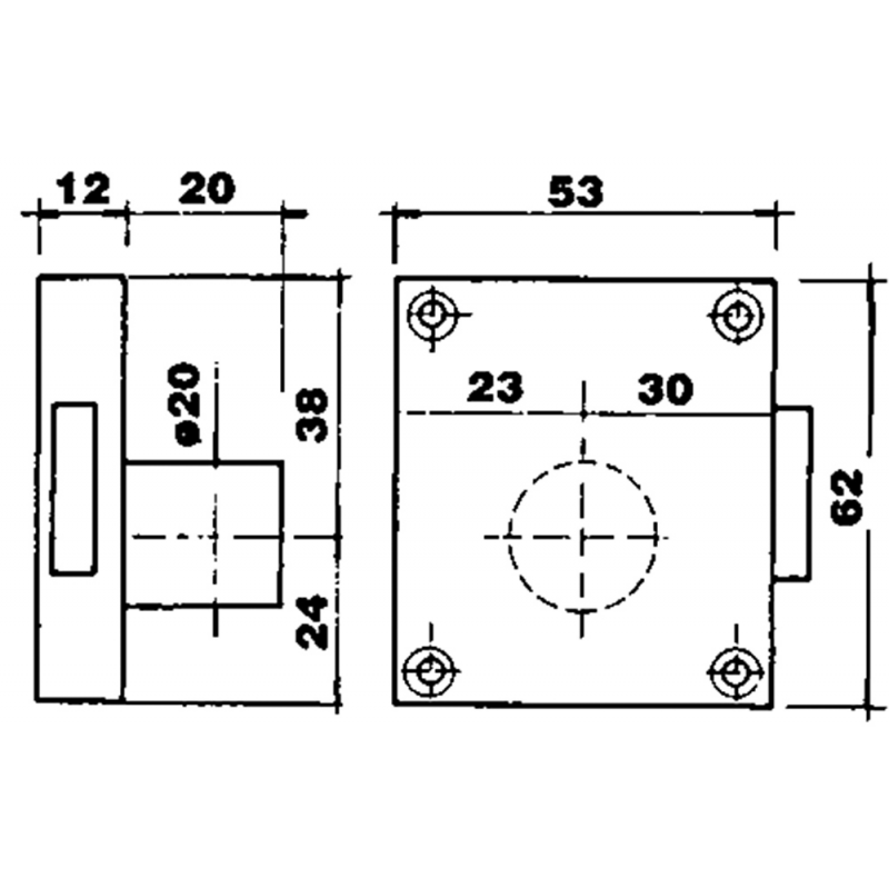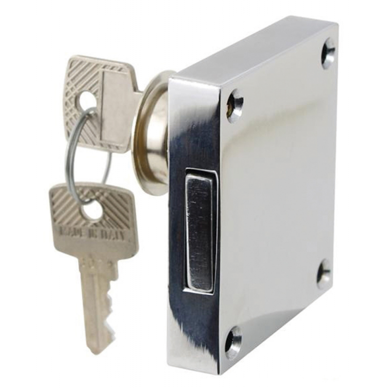 Serrature in ottone cromato da appoggio a due mandate, misura mm. 60×53,cilindro Ø mm. 20, sporgenza cilindro mm. 22, quadro mm.8