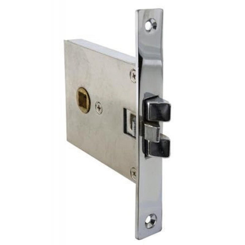 Serratura da incasso in ottone cromato a scrocco antivibrante. Incasso mm. 70x60x10. Mostrina mm. 110x16x2. Quadro mm. 8.