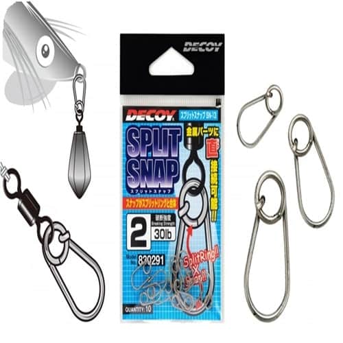 Il Moschettone Decoy Split Snap è un elemento di connessione che combina le caratteristiche di un anello su un lato e uno snap sull’altro lato, il collegamento di un piombo sul lato dell’anello consente di installarlo con un solo tocco efficace per la pesca profonda di cefalopodi quali seppie e polipi.