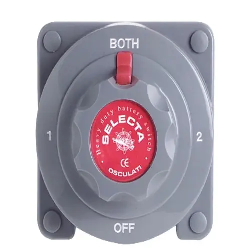 Stacca batteria deviatore che permette di usare alternativamente o insieme o staccare le batterie. Provvisto di rotatore con blocco a scatto di sicurezza. Omologato CE secondo la normativa 94/25/CE. Accessori per impianto elettrico barca camper.