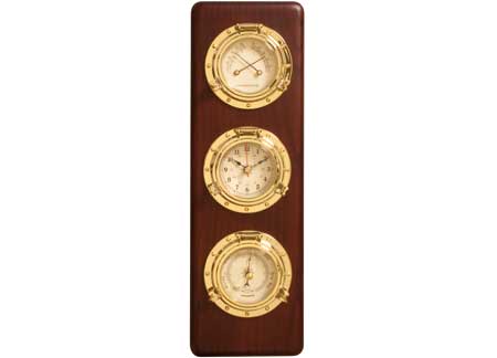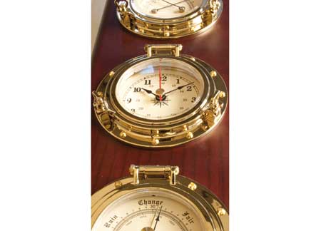 Stazione meteo con strumenti Ottonati in Zirconio lucidato a specchio. Barometro, orologio, termo/igrometro montati su tavoletta in Legno pregiato. Montaggio a parete.