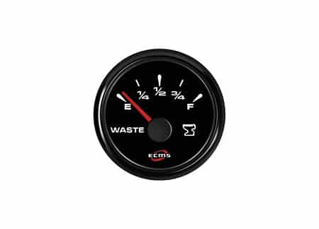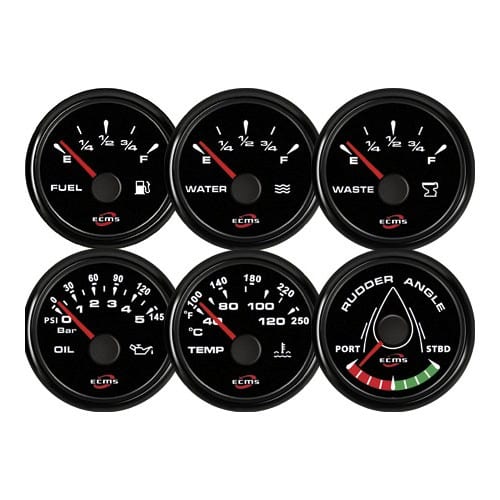 Strumentazione ecms di colore nero da 12/24V completa di cavetti e attacco molex con cornice e finitura nero, frontalino impermeabile IP67 con lente bombata anti-appannamento e quadrante con retroilluminazione personalizzabile multicolore led. Il valore standard 0-190 Ohm degli indicatori di livello 2361006 – 2361016 – 2361026 può essere facilmente modificato in 240-33 Ohm con il pulsante posteriore. L’amperometro 2361079 è completo di shunt.