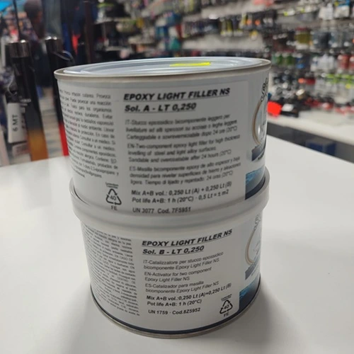 Stucco epossidico bicomponente per alti spessori a basso peso specifico per livellature su superfici di imbarcazioni in ferro, alluminio, vetroresina o leghe leggere. Stucco molto flessibile applicabile in una sola passata. EPOX LIGHT FILLER NS 0,250+0,250 ML SKIPPER YACHTING LINE