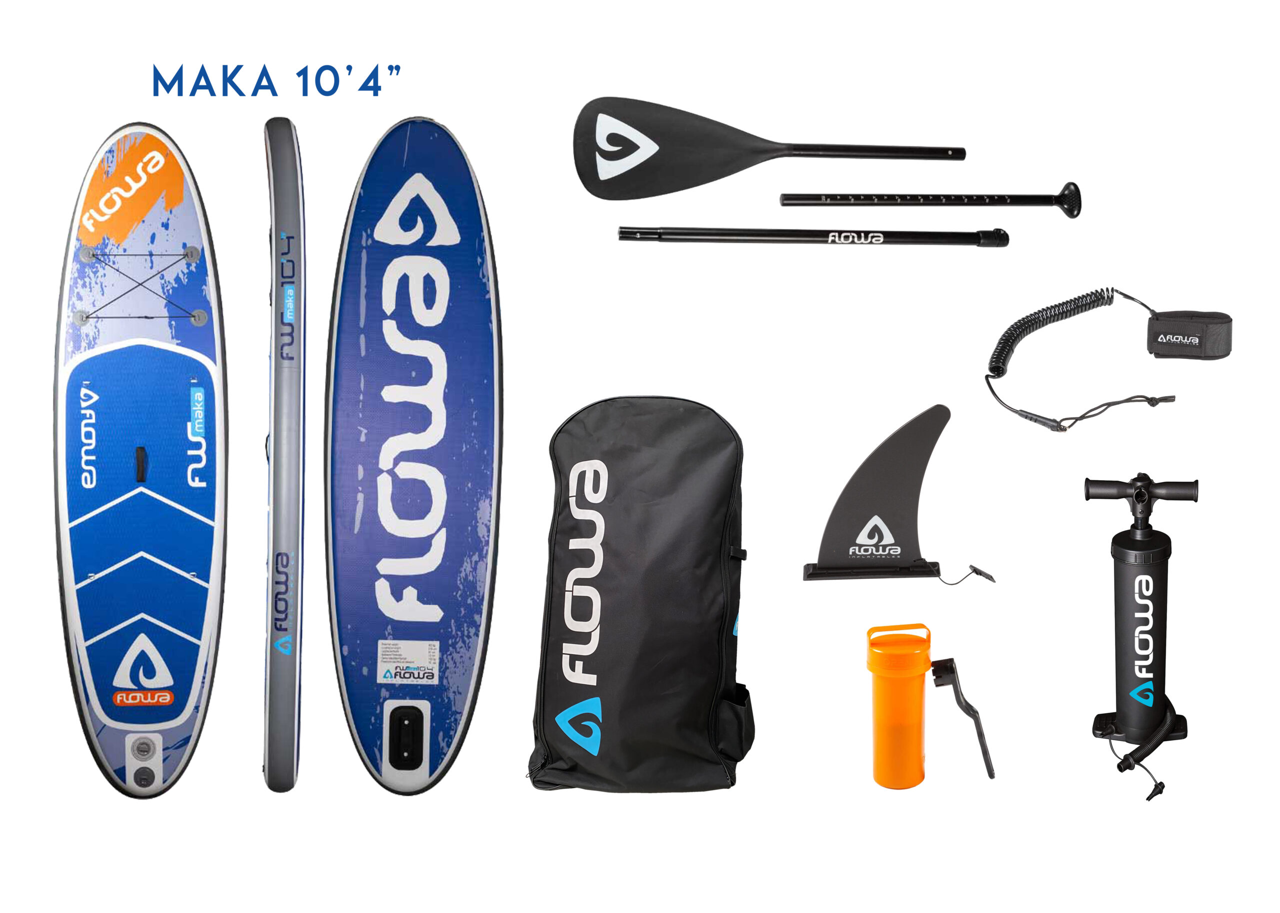 Tavola SUP gonfiabile Flowa realizzata con l’esclusivo sistema DROP STITCH che conferisce una grande rigidità alla tavola, aumentandone la stabilità e la compattezza, ma con un peso molto contenuto ed una capacità di carico maggiori. Il tappetino in EVA diamantato fornisce una grande aderenza, mentre il laccio di sicurezza garantisce un uso più sicuro in qualsiasi condizione. Sono dotate di una pinnetta centrale scorrevole estraibile, un D-ring in acciaio per il traino, un sistema di cordini elastici con fermo per il fissaggio dei bagagli, 4 D-ring in acciaio per agganciare il sedile (opzionale) ed una robusta maniglia in neoprene per facilitarne il trasporto. La confezione comprende: un robusto zaino con cerniera, il laccio di sicurezza, il gonfiatore con manometro, la pinna direzionale, la pagaia telescopica in alluminio ultraleggero e il kit di riparazione.