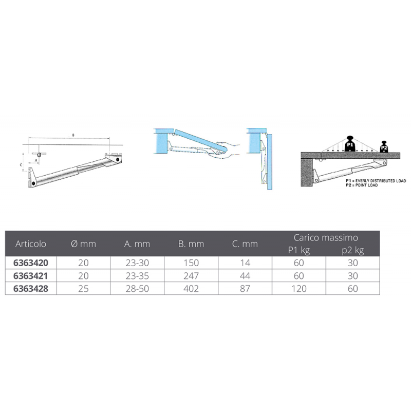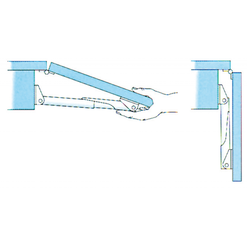 Supporto abbattibile in lega leggera anodizzata, per tavoli e mensole, di facile installazione. Lunghezza mm.150