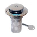 Tappo imbarco in fusione di acciaio inox AISI 316 lucidato a specchio completamente a filo, con cavetto inox di sicurezza e molla di richiamo. Per aprire premere e ruotare la parte superiore che fuoriesce automaticamente permettendo di svitare il tappo stesso.