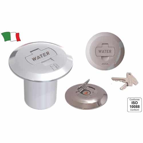 Tappo imbarco acqua in ottone cromato. Completo di levetta per apertura, chiavi e cavetto inox salvatappo.