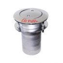 Tappo imbarco in fusione di acciaio inox AISI 316 lucidato a specchio completamente a filo, con cavetto inox di sicurezza e molla di richiamo. Fissaggio con prigionieri