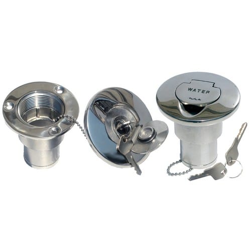 Tappo imbarco acqua in ACCIAIO INOX AISI 316 con chiave e viti a scomparsa. Completo di catenella salvatappo e anello di tenuta.