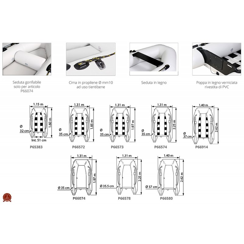 Tender costruiti in PVC 1100 Decitex “Plastel” composto da diversi strati, è estremamente ermetico e offre un’ottima resistenza all’abrasione, ai raggi uv e all’ambiente marino. Le valvole di gonfiaggio sono a filo dei tubolari. L’aleggio dello specchio di poppa è realizzato in due parti avvitate una nell’altra per una tenuta perfetta. Tutti i tender sono forniti del sacco per il trasporto, kit di riparazione, gonfiatore e n° 2 pagaie. FONDO A STECCHE 15 CM