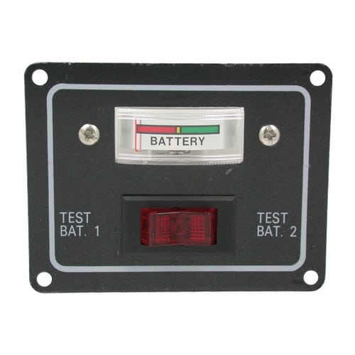 Pannello test batteria in alluminio con tester per stato di carica di una o due batterie e relativo interruttore per azionarlo.