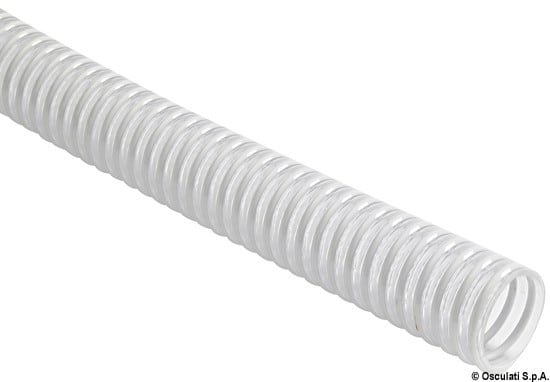 In PVC trasparente con spirale in PVC bianco molto morbido, accetta curve ridotte senza schiacciarsi. Atossico come da D.M. n.172.
