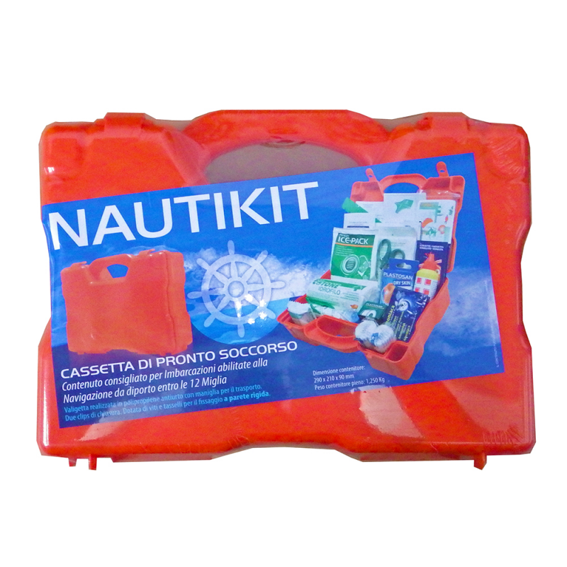 Valigetta pronto soccorsocontenitore in plastica colore arancio a tenuta stagna per Natanti finoa 10 mt di lunghezza e navigazione entro le 12 miglia dalla costa.Dim. mm. 290 x 215 x 90H. NON OMOLOGATA N°6 Buste garza sterile cm 18x40N°3 Buste garza sterile cm 10x10N°1 Flacone disinfettante da 125 mlN°2 Salviette STOP per punture d’insettiN°3 Salviette ammoniacaN°1 Pacco cotone compresso gr.125N°3 Bende di garza idrofila m 3,5 x cm 10N°2 Bende elastiche da m 4 x cm 8N°2 Buste monogel per ustioni gr 3,5N°1 Astuccio 40 cerotti assortiti DRY Skin CER041N°1 Rotolo Cerotto ad in TNT m5 x cm 2,5N°1 Paia di forbici tagliabendaggi cm 14,5N°1 Laccio emostatico in nitrile lattexN°1 coperta isotermica oro/arg COP216N°2 paia di guanti steriliN°1 stecca per fratture cm 22x3N°1 istruzioni prontosoccorso in 5 lingue