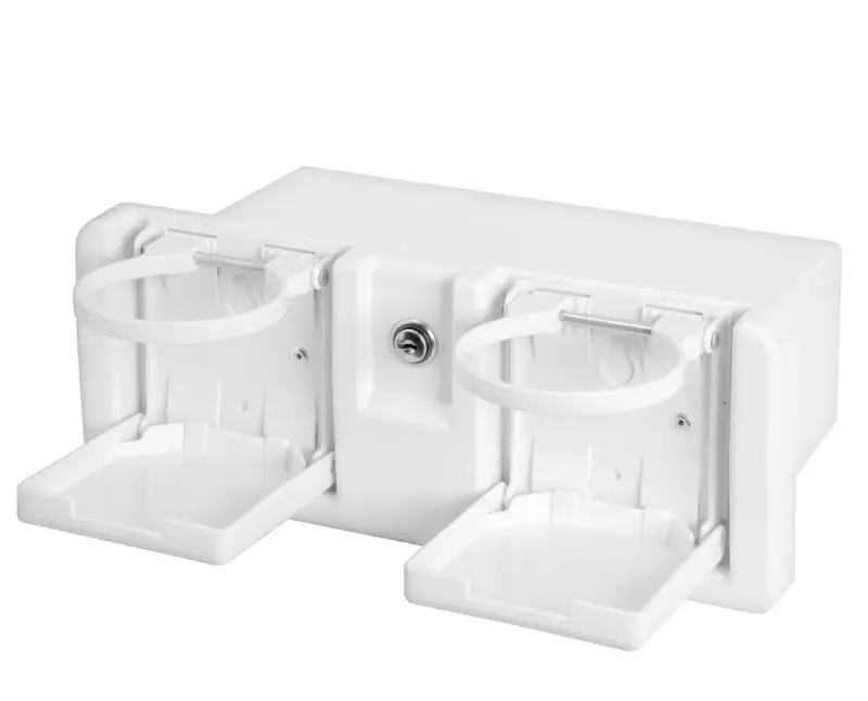 Vano portaoggetti con porta bicchieri fabbricato in plastica bianca completo di serratura a pulsante con chiave.