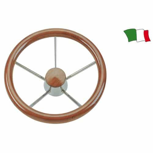 Volante a cinque razze in ACCIAIO INOX con impugnatura anatomica in teak. Conforme alle normative UNI EN 28848 – UNI ISO 29775 ed ABYC P22.